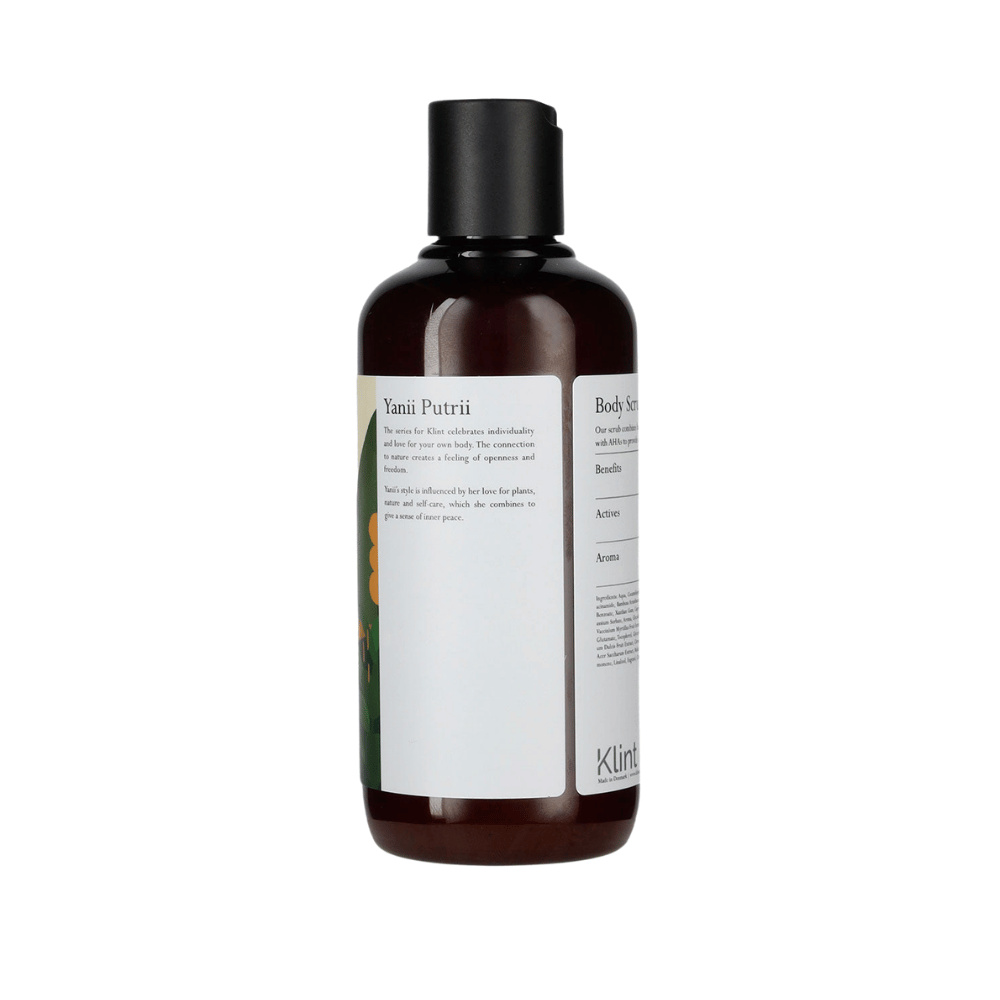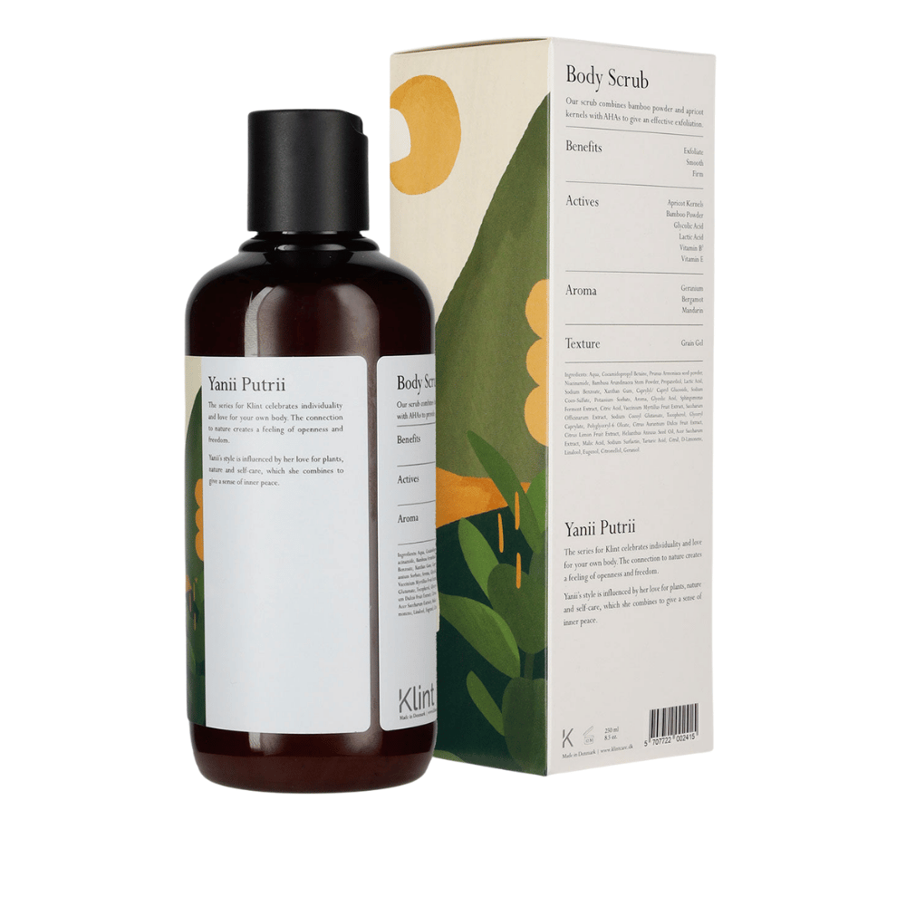 A Klint – Nature Feels testradír (250 ml) multi-hámlasztó formula: a barackmag-őrlemény és a bambuszpor finoman polírozza a bőrt, miközben az AHA-k (tejsav + glikolsav) kíméletesen segítenek leválasztani az elhalt hámsejteket. A márka ígérete szerint az eredmény azonnal érezhető: frissebb, simább bőrérzet és üdébb megjelenés. B3-vitaminnal (niacinamid) a ragyogóbb összkép támogatására. 100% vegán, szilikon-, ftalát-, PEG-, parabén- és mesterséges színezékmentesen. Illatát természetes olajok adják: bergamott–geránium–mandarin friss, tiszta kombinációjával. 99,9% újrahasznosított műanyag flakonban érkezik – tudatos, letisztult választás a fürdőszobában.